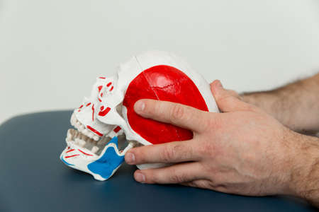 Doctor is holding a human skull in his hands. Professor studying human skeleton in lab. Skull model on the table in medical office for education. Osteopathy. Chiropractic treatment