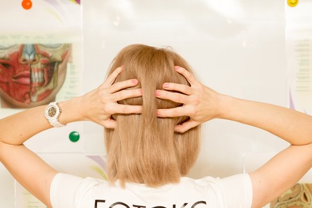 professional therapeutic neck and head massage. man the athlete in a massage room. pain recovery procedure. Female physiotherapist doing manipulative spine treatment on young patient.