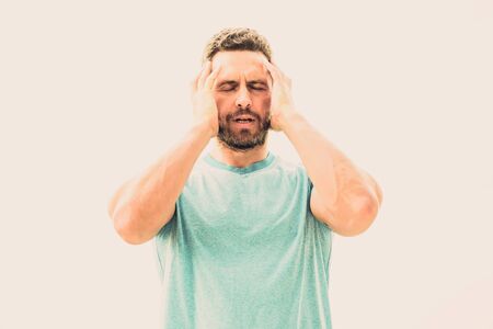 sportsman with athletic body. coach in fitness gym. after workout. man athlete in blue sport tshirt. sportswear fashion. male with beard. tired man isolated on white. he has headache. feel tired