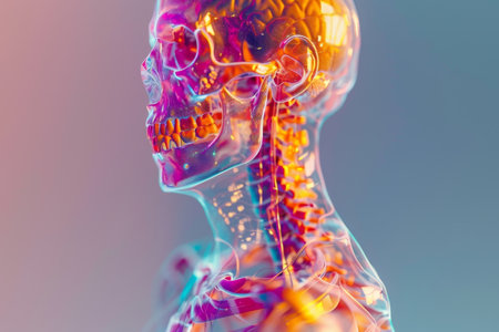 Colorful x-ray of human skull in profile view, digital art. Medical imaging and anatomy concept