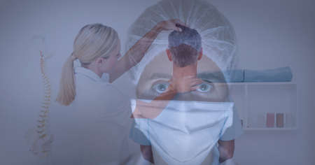 Portrait of female health worker wearing face mask against female doctor doing neck adjustment. healthcare and professionalism concept standing