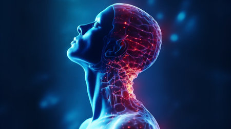Striking scientific illustration of a human brain and spinal cord network highlighted in vivid red on dark blue