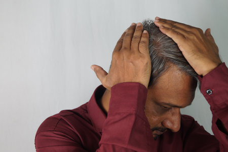 Man in his 50s, emotionally shaken showing stress or pain gesture. Feeling weak or depressed. Isolated on dark background.