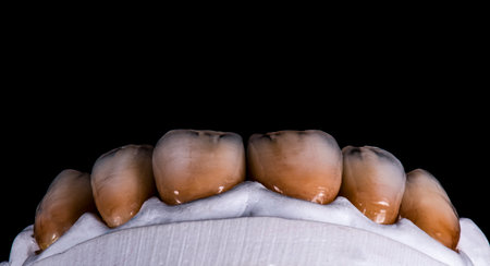 Crowns and veneers from high quality ceramics for vibrant jaws on the model, top view on black background