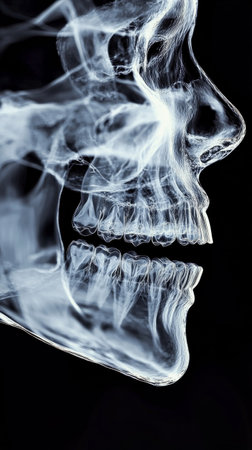 A close up X ray displaying the detailed bone structure of a human skull, highlighting the intricate jawline and teeth alignment. The focus is on the clarity and precision of the skeletal details.