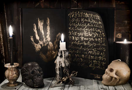 Occult grimoire, magic book laying on table with occult symbols, candles, pentagrams, fortune telling, ritual, altar, spiritism, secret knowledge, scull
