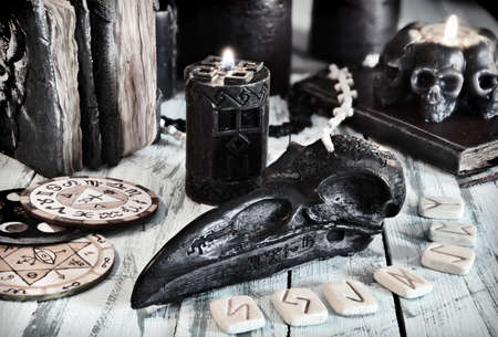 Still life with black candles, runes and witch book on old wooden table. Esoteric, gothic and occult background, Halloween mystic concept.
