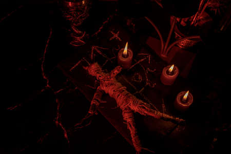Voodoo doll, black candles, pentagram and old books on witch table. Occult, esoteric, divination and wicca concept. Mystic, voodoo and vintage background.