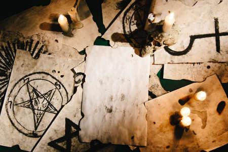 occult symbols laying on table with candles, pentagrams, fortune telling, ritual, altar, spiritism, secret knowledge, scull. Empty space