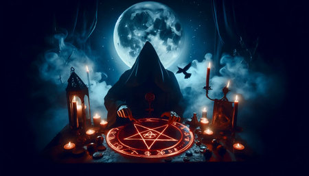 A hooded figure in a black robe draws a glowing pentagram on a stone altar under a blood moon, Ai created image