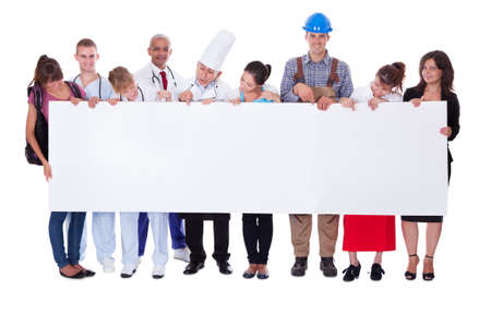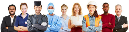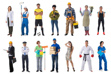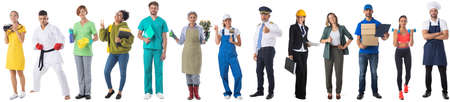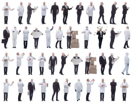 Full length portraits of a group of people of diverse different professions of business, medicine, construction industry on white