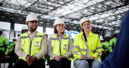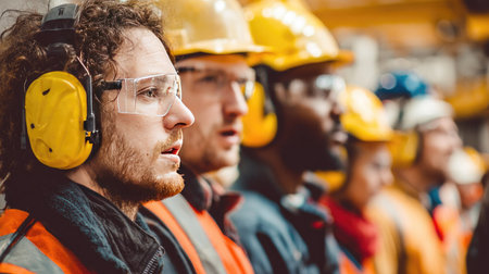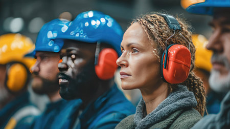 Group of workers all wearing protective earmuffs and helmets during a training session in a loud environment