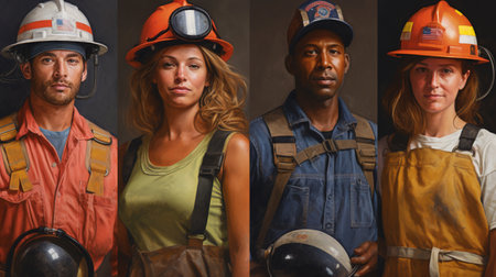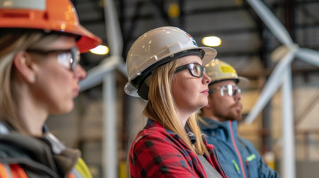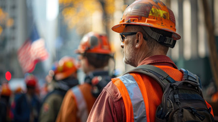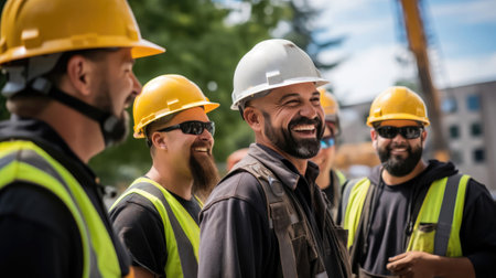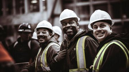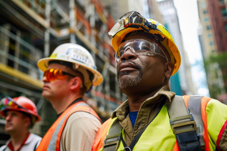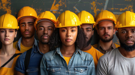A group of construction workers in bluecollar workwear, helmets, and safety goggles gather at the site, ready to work with their personal protective equipment