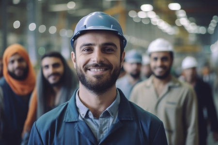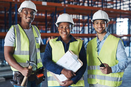 Portrait of group engineers or factory workers. Labors that are diverse racial within an industrial plant. Happy workers in the warehouse.