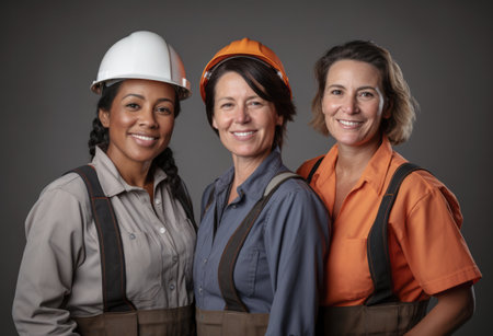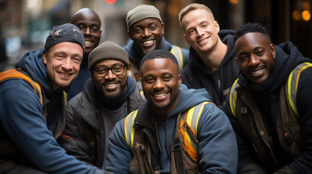 Portrait of diverse male construction workers in colorful uniforms posing confidently as a team against a plain backdrop.