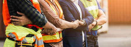 Unity and success concept.Bottom view of Engineer team people standing hands holding together at the container yard.