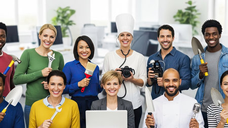 A diverse group of individuals, representing various professions, stand together holding tools. The image displays a bright indoor environment. The subjects wear different outfits and their expressions suggest satisfaction. It's ideal for illustrating themes of teamwork, collaboration, and various commercial projects.