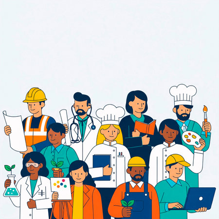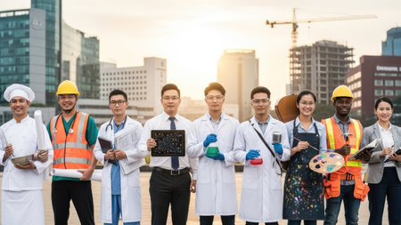 A diverse group of professionals pose outdoors against a cityscape, showcasing various occupations. The image presents a collaborative atmosphere, with the subjects in professional attire and work wear. Bright sunlight illuminates the scene, creating a sense of unity, ideal for representing careers and teamwork. Suitable for editorial and commercial use.