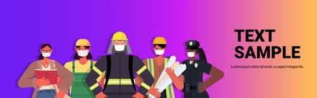 Group of people with different professions on white background, horizontal. Modern workers of diverse occupations, male and female models like accountant, barber, doctor, accountant in face masks