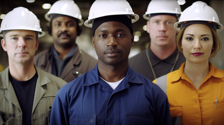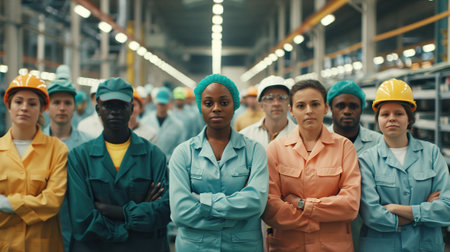 Photo of a diverse group of factory workers in pastel-colored uniforms, standing together in front of assembly lines, with space for text, captured with a 35mm lens at f/2.0, --ar 16:9 Job ID: 8418abd6-b2b8-49ba-b9bf-58ea6326ca9e