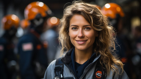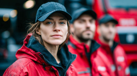 Confident female firefighter in red uniform standing with team near fire truck, symbolizing courage and teamwork.