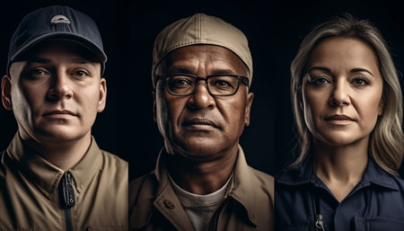 Side-by-side portraits of logistics workers in uniforms, each representing a different phase of the supply chain. Captured in a studio with a clean background and soft shadows.