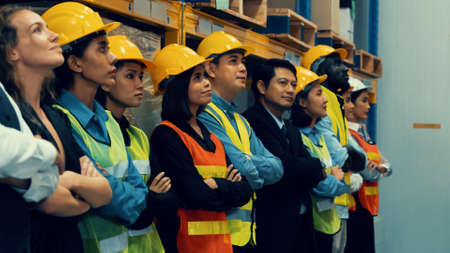 Large group of factory worker standing together in warehouse or storehouse . Logistics , supply chain and warehouse business concept .