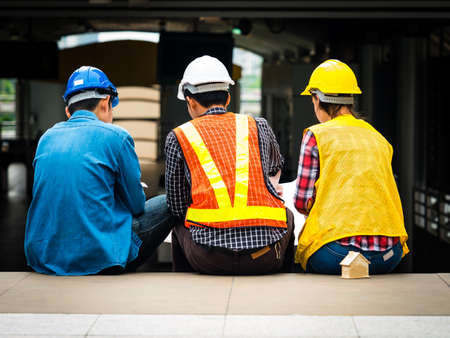 Group of technician or workers sit in front of the door of factory and end of work and they look sad.