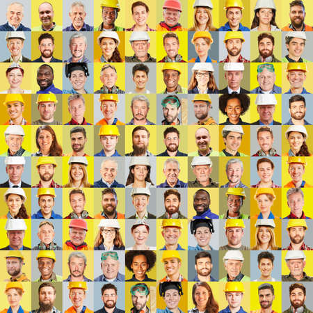 Collage of employee portraits from industry, construction and craft in front of a colored background