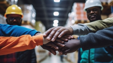 A group of workers or engineers joyfully join hands, symbolizing strong teamwork and success in their work or any project. Diverse ethnicity of engineers or working touching hand together.