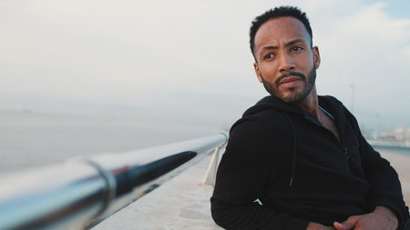 Portrait of goodlooking young African athlete wearing stylish shades and black outfit looking happy and cheerful sitting on sidewalks at sea waiting for his friend to joi : Generative AI