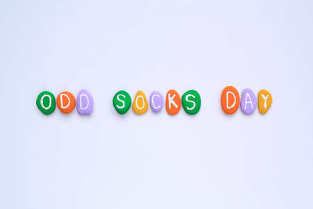 Odd socks day lettering on white background. Social school bullying concept. Lost lonely socks. Top view flat lay idea for poster, banner, advertising