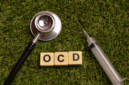 Top view of stethoscope, syringe and alphabet letters with text OCD stands for Obsessive Compulsive Disorder.