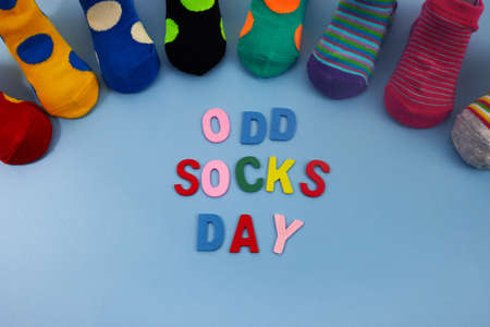 Odd Socks Day. Day lost socks, lonely socks on blue background.