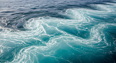 An aerial view of turbulent ocean water, showing deep blue and turquoise currents swirling together to create intricate, marbled patterns and white foam. The powerful movement of the sea creates a dynamic and abstract natural texture. This image signifies power, motion, and the untamed beauty of nature.