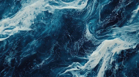 Deep blue ocean water with swirling waves and splashes. Top view of vibrant seascape with sea water