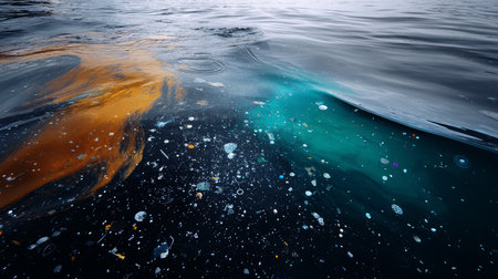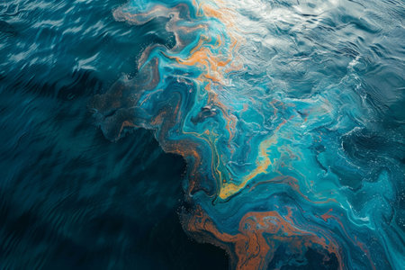 A close-up of oil spills mixing with seawater, creating swirling patterns of dark oil and light water, highlighting the stark contrast.