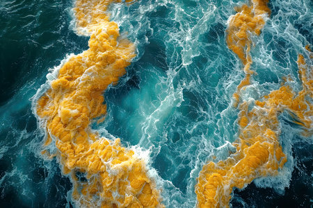 seaweed floats gracefully against the crashing waves in this stunning aerial photograph. the cloudy sky and vast expanse of the sea create a mesmerizing backdrop. the dark teal and white color scheme, along with the loose paint application, gives the image a unique artistic touch. with its muted color palette and marble-like appearance, this aerial view captures the essence of a marine painter's vision. ai