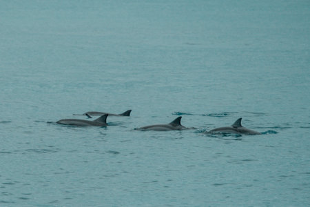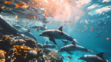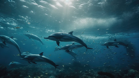 A captivating scene featuring a school of dolphins swimming together in crystal-clear ocean waters, showcasing their playful nature and beauty in motion.