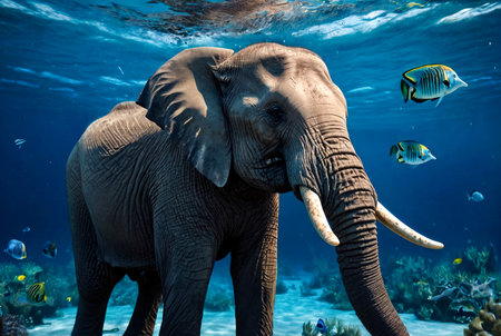 Generative Ai illustration of african elephant swimming blue underwater. Big elephant in ocean with reflections on water surface. Animal wildlife concept. Cartoon illustration. Copy ad text space
