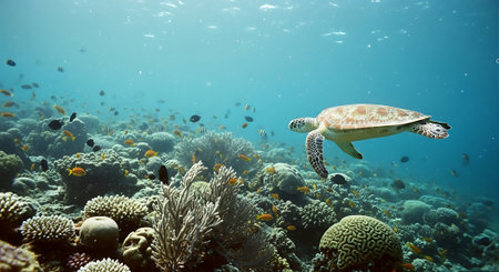 Rich underwater scene with turtle, surrounded by coral and fish, showcasing ocean vivid ecosystem.