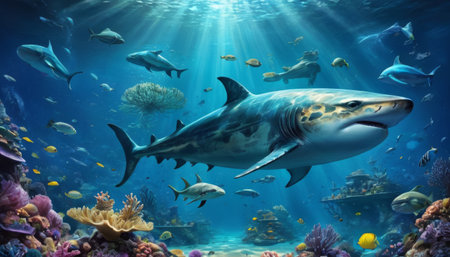 A vivid underwater scene featuring a large shark among diverse marine life, with sunbeams piercing through the water.. AI Generation