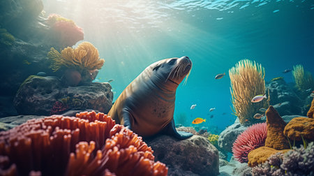 a seal gracefully swims along the seashore, surrounded by a vibrant coral reef. the hyper-realistic atmosphere captures the sunrays illuminating the scene, enhancing the vivid color scheme. the naturalistic depictions of flora and fauna create a captivating visual experience. this stunning image is reminiscent of the immersive worlds found in sketchfab and imax, appealing to fans of caninecore aesthetics. ai generated