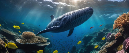 Whales are swimming underwater with beautiful colorful corals.