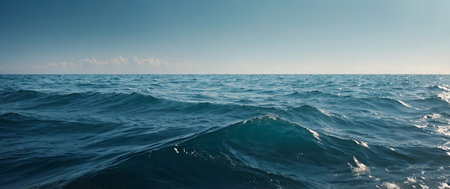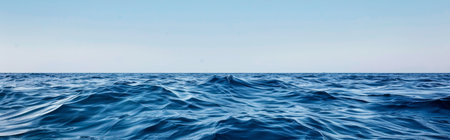 This image showcases the peaceful surface of the ocean, capturing the tranquility of blue waves against a clear, expansive sky, ideal for relaxation themes.