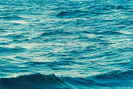 Very nice sea water background or backdrop with selective focus. Small waves of natural water surface texture. Still calm ripples colorful blue wave in a river or ocean.