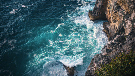 A stunning aerial view of a cliff by the ocean, where the fluid water meets the natural landscape, creating a picturesque and tranquil scene under the open sky AIG50