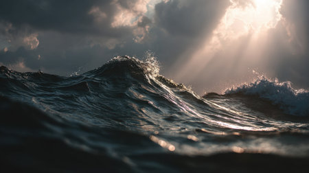 Experience the beauty of majestic ocean waves illuminated by radiant sunlight breaking through dramatic clouds, evoking a sense of tranquility and nature's power.