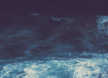 Deep blue ocean water with swirling waves and splashes. Top view of vibrant seascape with sea water