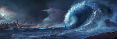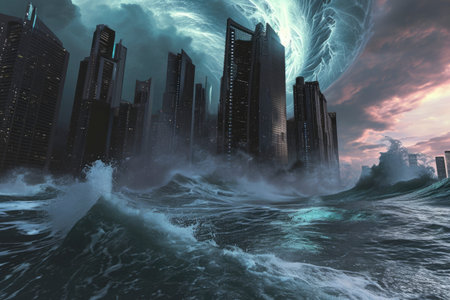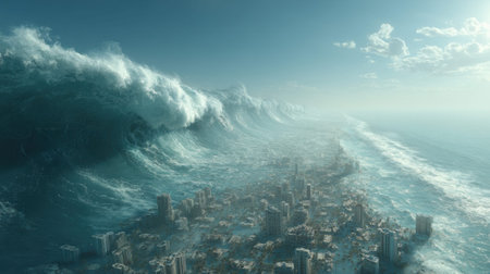Tsunami wave apocalyptic water view urban flood Storm. 3D illustration